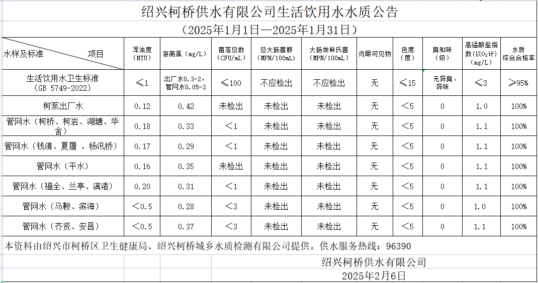 紹興柯橋供水有限公司生活飲用水水質(zhì)公告(2025年1月1日—2025年1月31日)