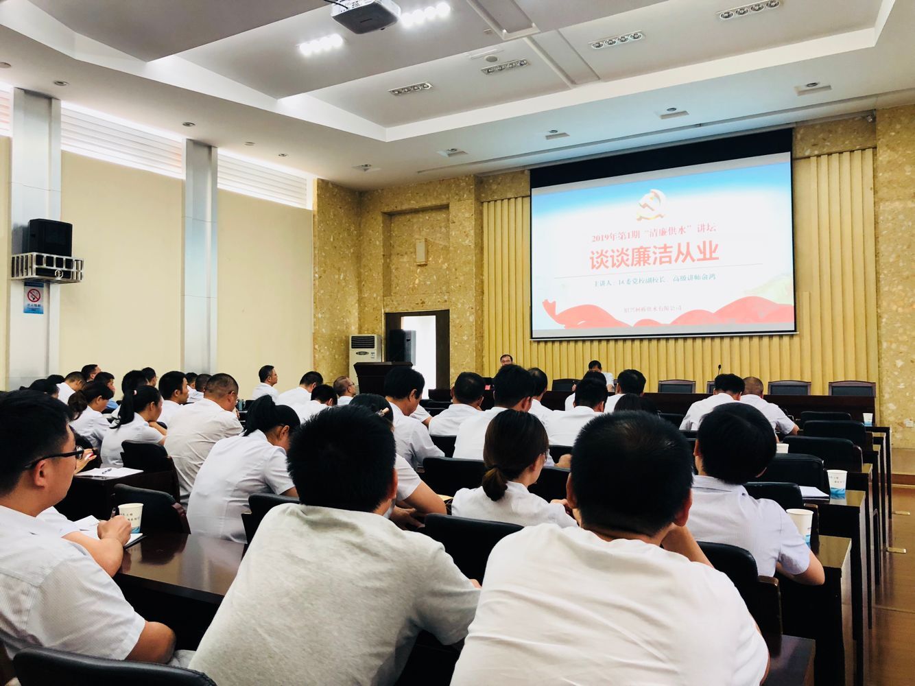 俞老師圍繞“廉潔從業(yè)”這一主題,給大家講明形式、劃清紅線,既有深入淺出的理論闡述,又有廣征博引的案例分析,更有實踐層面的對策思考,向我們深刻闡述了新時代下的新理念、新觀點、新論斷,指出在全面從嚴治黨新形勢下,全體黨員及干部要自覺做到“拒腐蝕、永不沾”,把遵紀守法、廉潔奉公作為自己的生命線,時刻保持對廉潔從業(yè)的敬畏尊崇,時刻用身邊的典型案例警示自己,時刻筑牢廉政建設的防線。以積極陽光的姿態(tài)爭當廉潔從業(yè)好員工,為供水事業(yè)發(fā)展做出更大的貢獻。