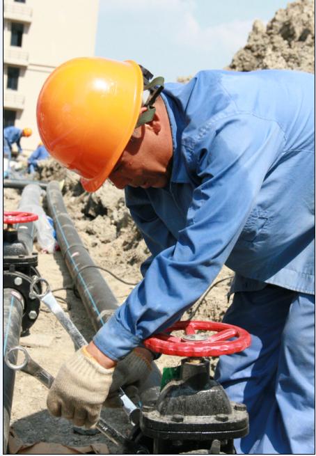 供水公司職工頂烈日安裝供水管線
