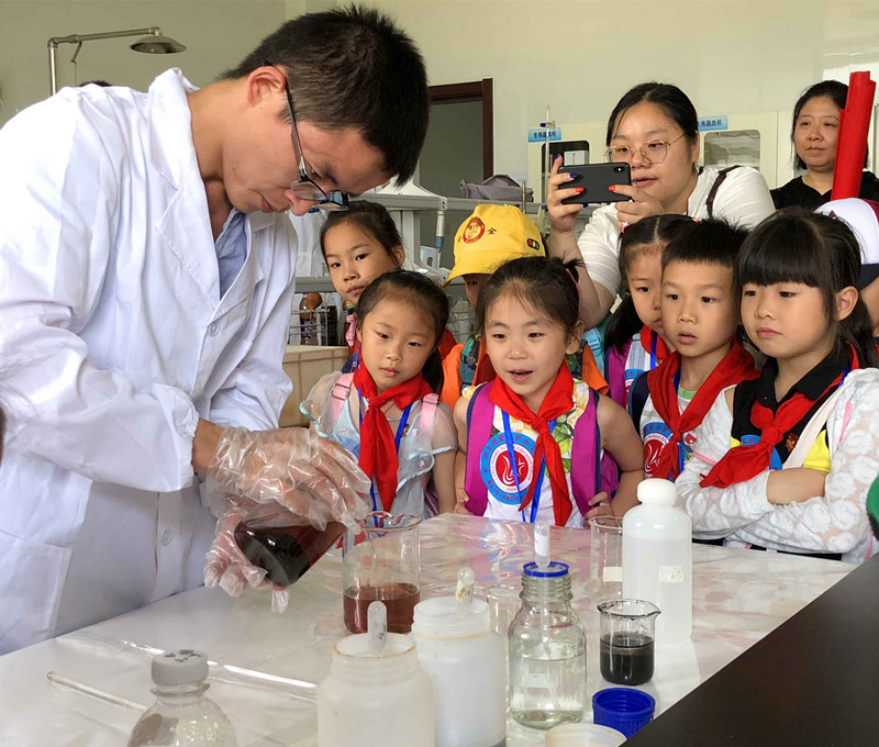 “經(jīng)過三天三夜,混濁的污水就這般變得干凈了。現(xiàn)在,讓我們把這個時間縮短,來一次奇跡的見證。”實驗室里,學(xué)生們圍繞在實驗試劑的瓶瓶罐罐旁,平日里嚴(yán)謹(jǐn)?shù)膶嶒灱夹g(shù)人員瞬時變成了神奇的魔術(shù)師。“這就是我們平時未經(jīng)處理的工業(yè)印染污水,只有通過一系列的污水處理環(huán)節(jié),污水才能被排放至河流和大海中。”實驗室技術(shù)人員拿出用作處理污水的專業(yè)試劑,開始帶領(lǐng)學(xué)生做“污水絮凝沉淀”實驗。用膠頭滴管吸取試劑,使用玻璃棒攪拌、靜置,通過一系列的專業(yè)步驟,一杯杯污水慢慢地開始變清。“這就是絮凝沉淀實驗,通過加入‘混凝劑’,水中的污染物被不斷凝聚,最終沉淀至燒杯底部,從而使污水變清。”學(xué)生們一邊認(rèn)真聽講一邊情不自禁“哇,水變清