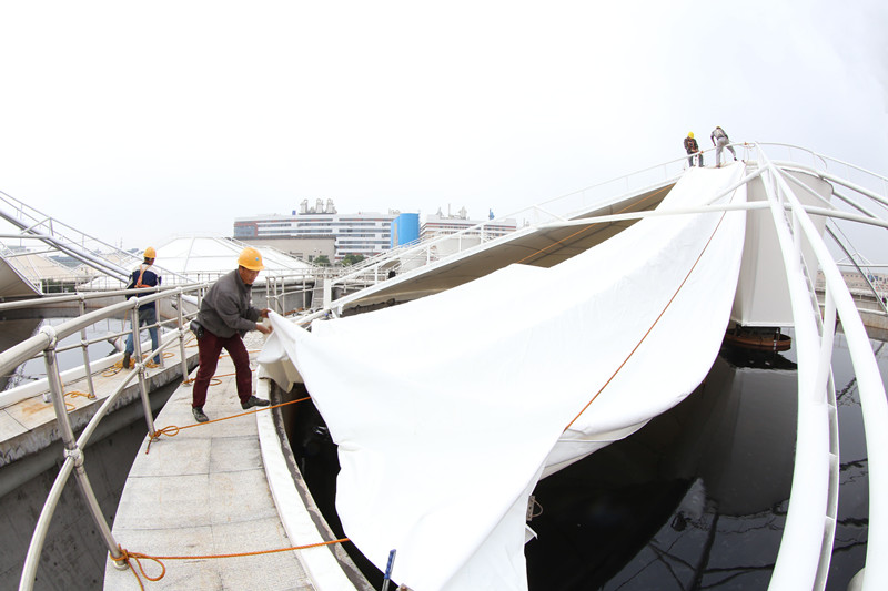 日前,江濱水處理公司20萬(wàn)噸/日集中預(yù)處理二期工程污泥濃縮池進(jìn)入鋼結(jié)構(gòu)膜安裝階段,預(yù)計(jì)于本月底基本完成。該除臭系統(tǒng)由8個(gè)鋼結(jié)構(gòu)反吊膜裝置及2個(gè)生物除臭裝置組成,為公司第四批建設(shè)的除臭項(xiàng)目。至此,公司在臭氣治理上已累計(jì)投入2000余萬(wàn)元,目前廠區(qū)內(nèi)高、中濃度臭氣基本實(shí)現(xiàn)全收集、全治理,為實(shí)現(xiàn)“生態(tài)江濱”目標(biāo)打下了堅(jiān)實(shí)基礎(chǔ)。