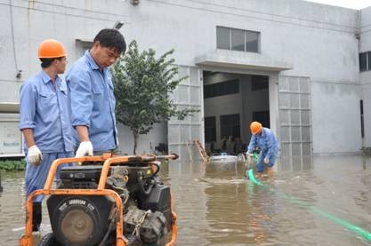 10月9日上午9點,公司接到位于安昌鎮的杰杰紡織有限公司的求助電話,該公司受臺風“菲特”影響,廠區內積水嚴重,請求協助排水。