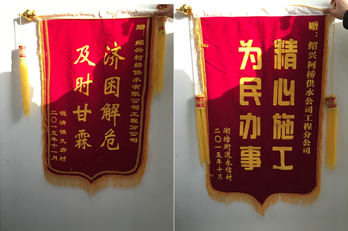 12月29日下午,公司相繼收到湖塘街道永信村和錢清九巖村村委送來的“濟困解危,及時甘霖”和“精心施工,為民辦事”兩面錦旗,對工程分公司工作人員辛勤勞動、甘于奉獻的工作精神表示贊賞和感謝。